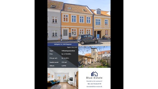 Blue-Estate Erhvervsmægler udbyder en attraktiv udlejningsejendom beliggende på Adelgade 36, 5400 Bogense.