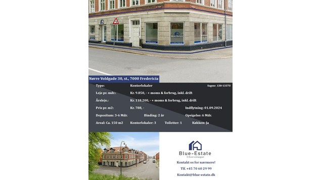 Spændende nyhed! Hos Blue-Estate Erhvervsmægler har vi nu fornøjelsen af at introducere vores egne lokaler til udlejning på Nørre Voldgade 30, stuen, 7000 Fredericia, da vi skal videre til andre lokaler i byen.