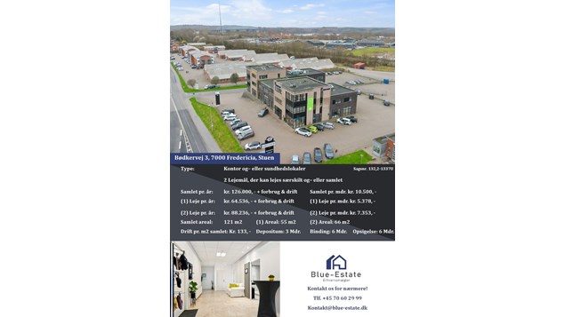 Vi har hos Blue-Estate fået 2 lejemål til udlejning på Bødkervej 3 i Fredericia, som bl.a. kan benyttes til kontor og- eller sundhedslejemål.