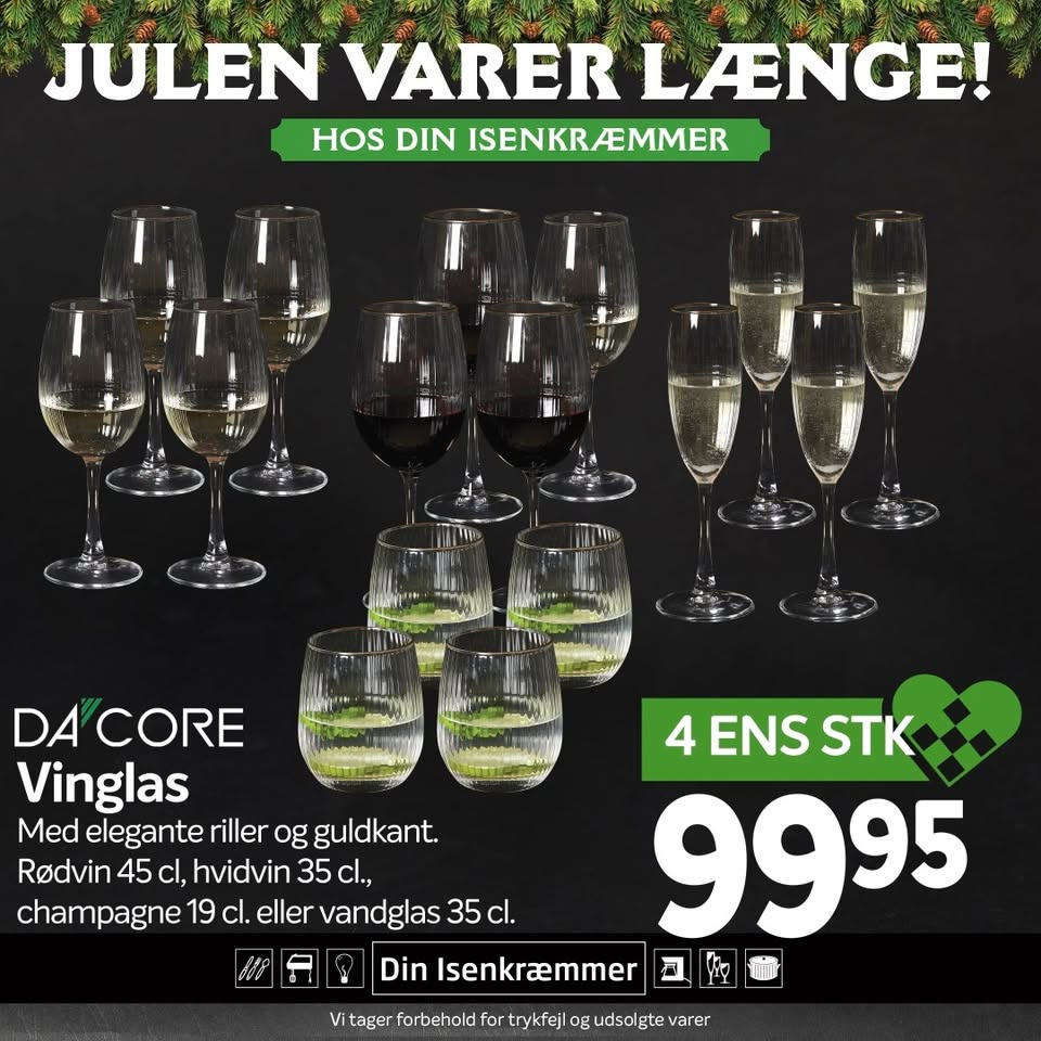DA’CORE-vinglassene emmer af elegance - med smukke riller og guldkant, der fanger lyset fra julens stearinlys