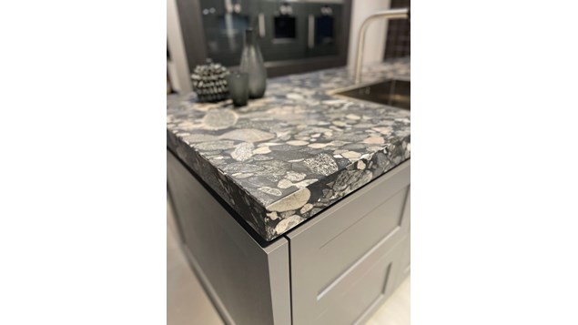 Her er granitbordpladen skåret i smig og bygget op med kanter for et ekstra voluminøst udtryk