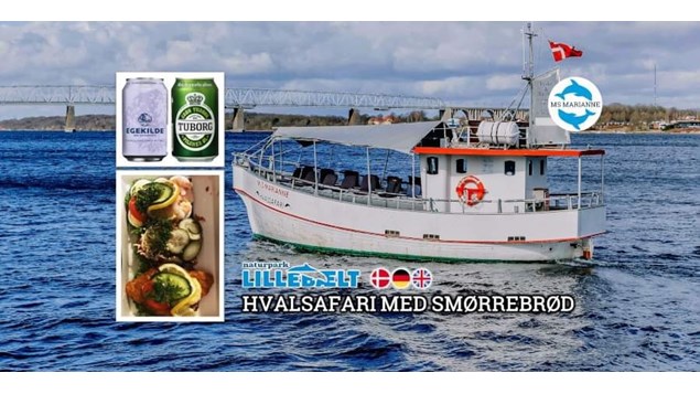 Senere samme dag kan du nyde en hvalsafari med uspecificeret smørrebrød leveret fra Jannes Køkken Fredericia, inklusiv en øl eller sodavand. Vi sejler ud fra Fredericia Gammelhavn, og skipper eller guide vil igen fortælle interessante historier om området, marsvin, broerne og meget mere.