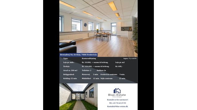 På udkig efter et professionelt og moderne kontorlejemål? Blue-Estate Erhvervsmægler har nøglen til din nye arbejdsplads på Brovadvej 56 i Erritsø, et levende industriområde i Fredericia.