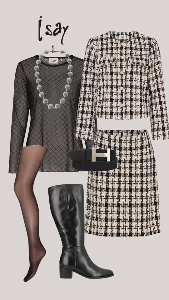 Dette sæt kombinerer tidløs tweed i sort/hvid med feminine detaljer og en moderne kant.